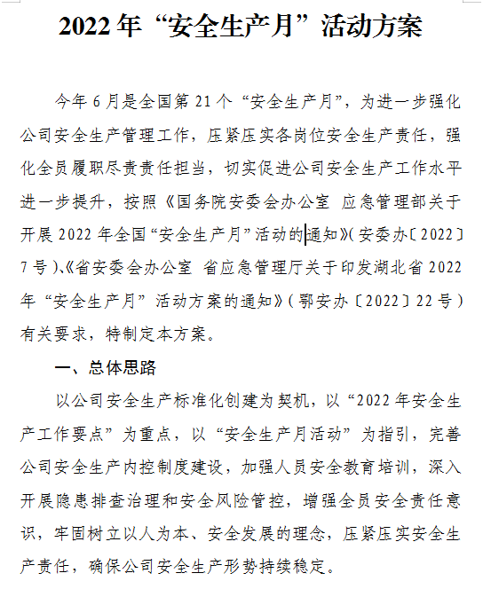 5月31日,公司研究制定了《2022年“安全生產(chǎn)月”活動(dòng)方案》,成立了“安全生產(chǎn)月”活動(dòng)領(lǐng)導(dǎo)小組,并以活動(dòng)領(lǐng)導(dǎo)小組為核心,全面部署開(kāi)展安全生產(chǎn)月專項(xiàng)活動(dòng),積極動(dòng)員公司全員參與,充分彰顯了領(lǐng)導(dǎo)帶頭抓安全、人人講安全的良好風(fēng)貌。